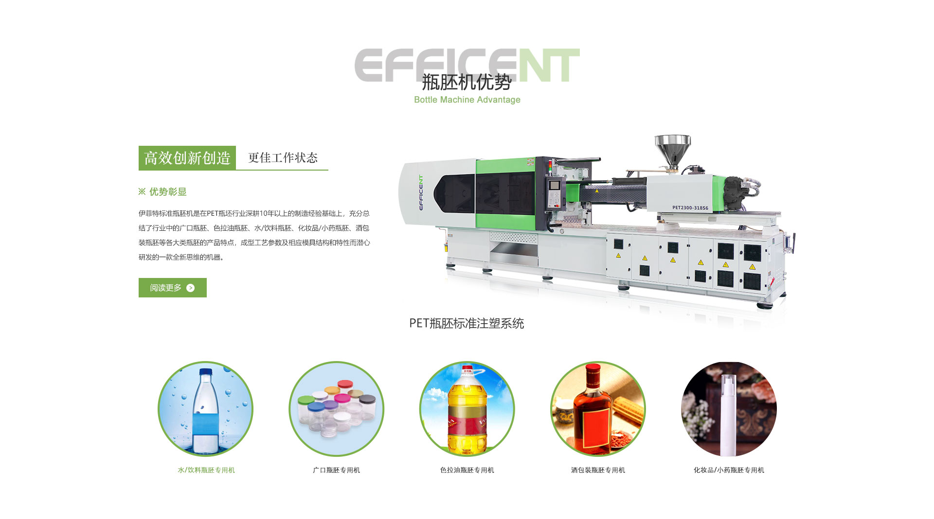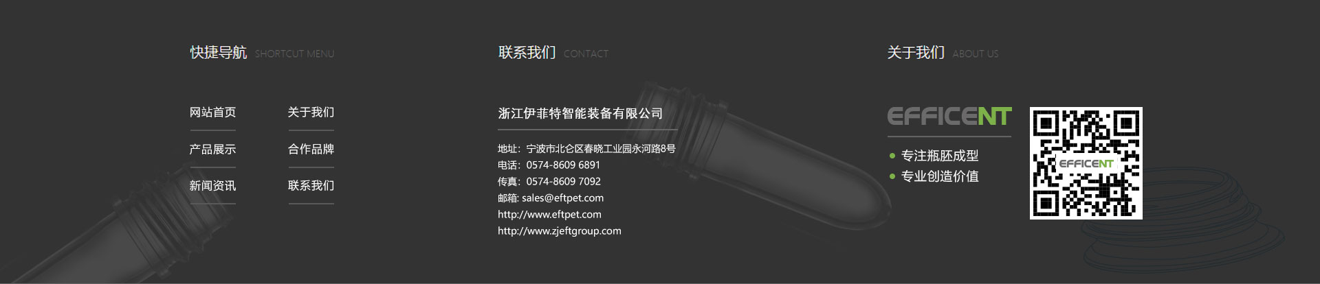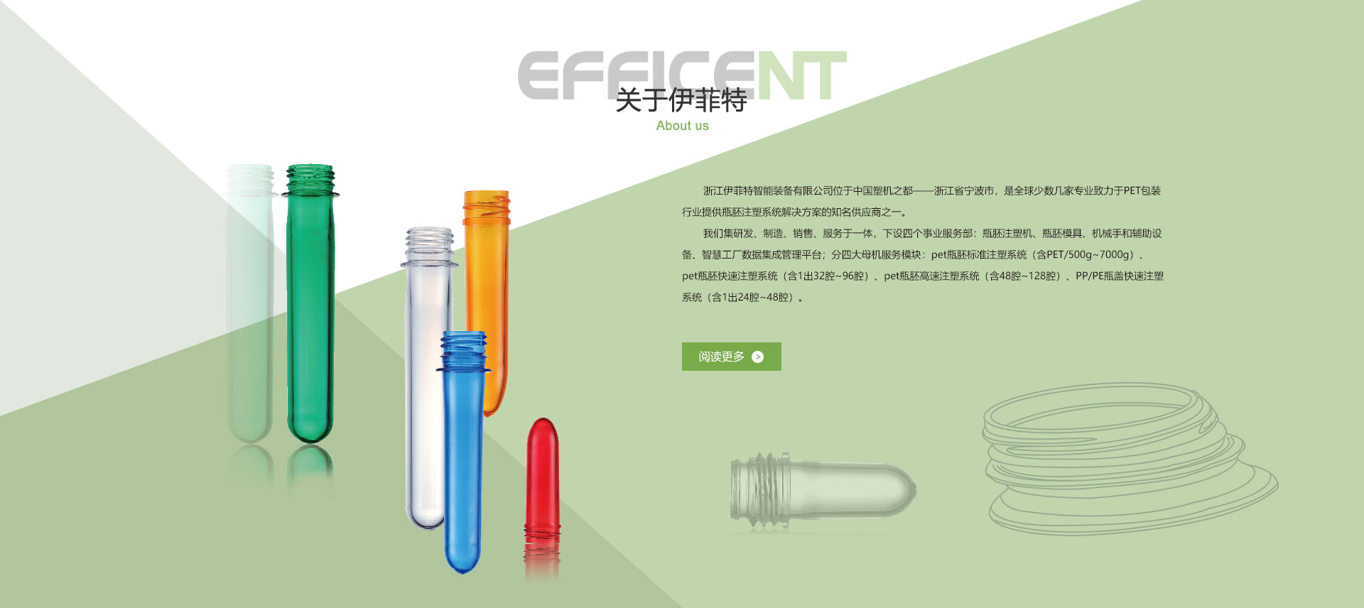 作品简介:浙江伊菲特智能装备有限公司位于中国塑机之都——浙江省宁波市,是全球少数几家专业致力于PET包装行业提供瓶胚注塑系统解决方案的知名供应商之一。
