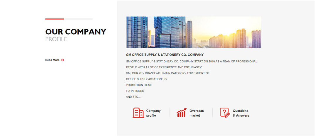 作品简介:GM OFFICE SUPPLY & STATIONERY CO. COMPANY START ON 2010 AS A TEAM OF PROFESSIONAL PEOPLE WITH A LOT OF EXPERIENCE AND ENTUSIASTIC GM, OUR KEY BRAND WITH MAIN CATEGORY FOR EXPORT OF: OFFICE SUPPLY &STATIONERY PROMOTION ITEMS FURNITURES AND ETC…..